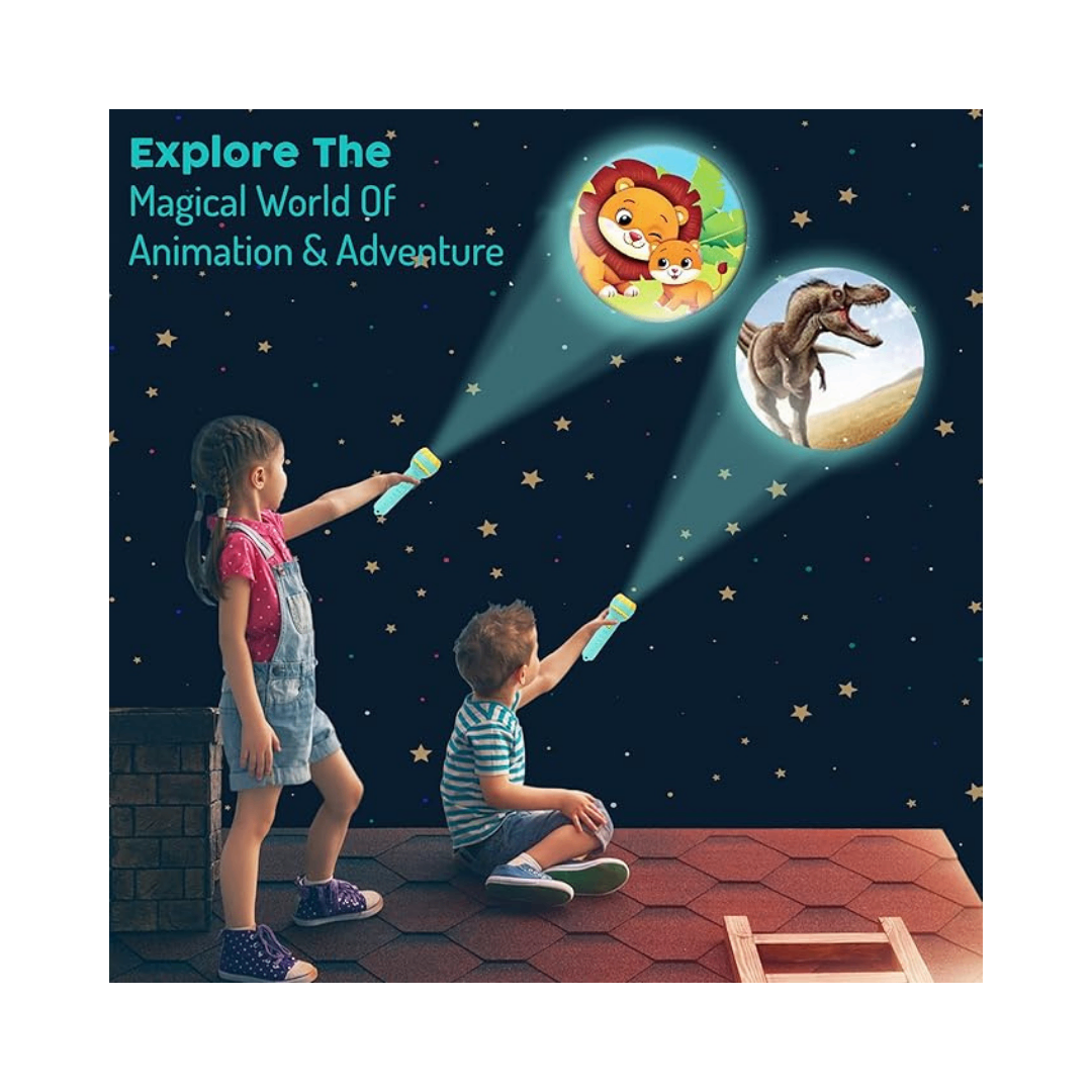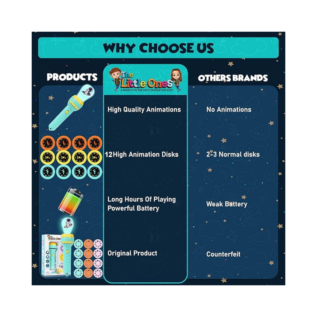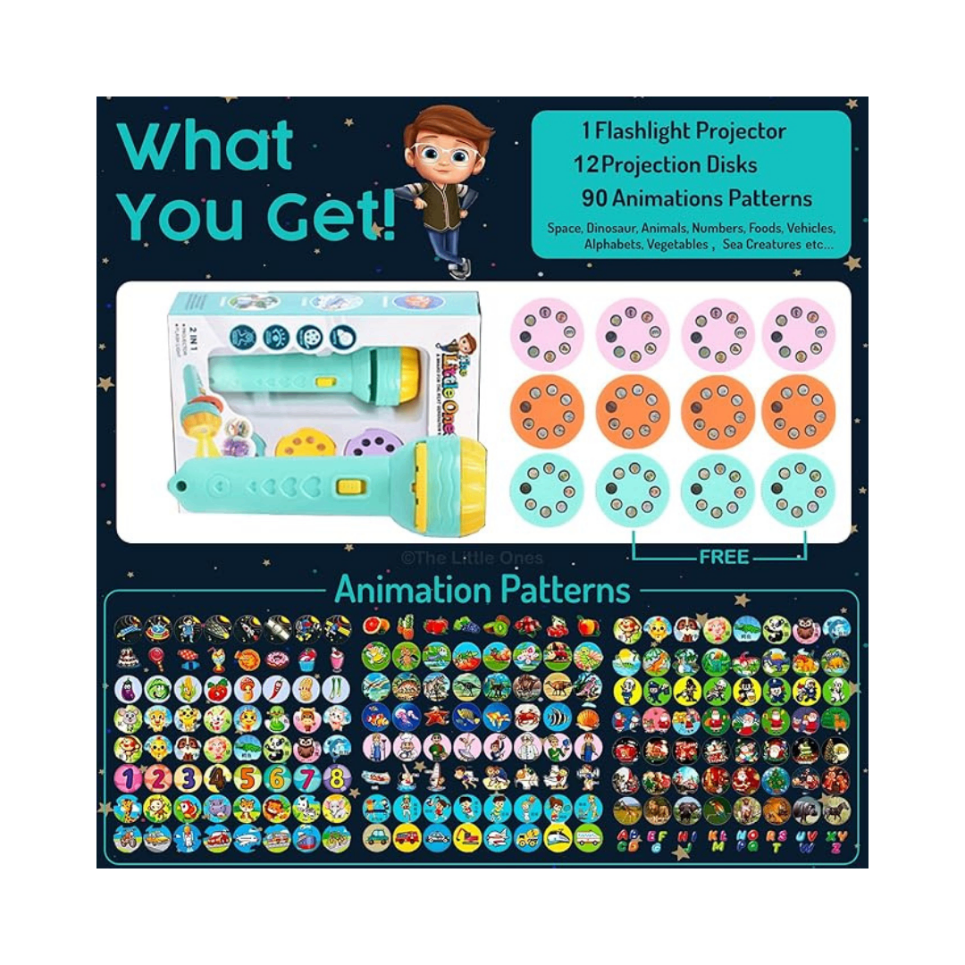 • THE LITTLE ONES FLASHLIGHT PROJECTOR - The Little Ones Flashlight Projector is extremely interesting seeing pictures, telling stories and stimulating your kids language and cognitive skills, so they can enjoy the time with family or their friends. This flashlight projector contains of 12 projection disk a total of 96 animated patterns-Space,Dinosaur,Animals,Numbers,Foods,Vehicles,Alphabets,Vegetables,Sea Creatures & Much More